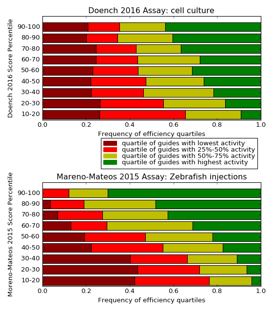 Similarly, efficiency scoring is not very accurate: guides with low scores can be efficient and vice versa. As a general rule, however, the higher the score, the less likely that a guide is very inefficient. The following histograms illustrate, for each type of score, how the share of inefficient guides drops with increasing efficiency scores: