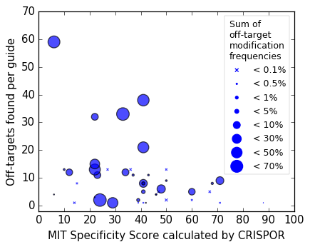 Like most algorithms, the MIT specificity score is not always a perfect predictor of off-target effects. Despite low scores, many tested guides caused few and/or weak off-target cleavage when tested with whole-genome assays (Figure 2 from Haeussler et al. 2016), as shown below, and the published data contains few data points with high specificity scores. Overall though, the assays showed that the higher the specificity score, the lower the off-target effects.